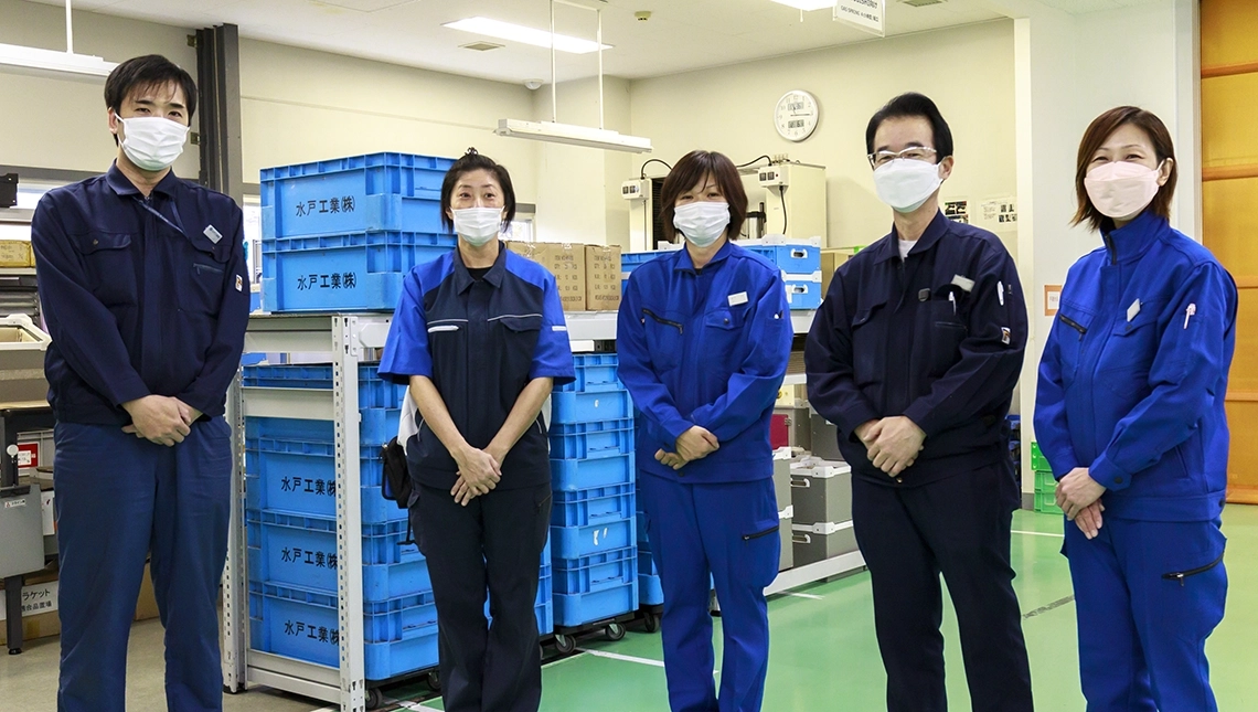製造部の第1グループは、水戸工業の営業が完成車メーカーから受注した自動車部品の組立作業を担っています。発注先から入庫する複数の製品を組み立ててひとつの部品として完成させますが、ガススプリングなどの部品ではホコリやチリの混入による動作不良を防止するため、作業はクリーンルームで行われています。組立工程の中心戦力はパート・アルバイトの方たちで、作業現場では組み立て作業に加えて外見の目視や機能など、品質保証部が定めた項目に沿って検査業務が行われます。正社員は作業計画を組み、進捗状況を見ながら必要であれば追加の指示を出すなど、現場の作業をコントロールしていきます。また、お客様の受注に基づいた生産・出荷計画を作成し、製品の受け入れから保管、在庫管理、出荷といった各工程での関連業務、作業員の労務管理といったマネジメント業務も担当します。